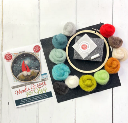 Create these funny little gnomes with The Crafty Kit Company’s Gnomes in a Hoop Needle Felting Craft Kit. Designed for all skill levels, this kit includes wool, a wooden hoop, essential tools, and clear instructions to craft two delightful gnomes.